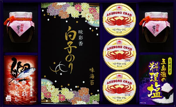 2012-02-24 快気祝い内祝い好適品【味彩香 錦撰】 味彩香 錦撰5250円(税込)●内容/白子味のり:8切5枚12袋、マルトモかつお削りぶし:1.5g×5、五島灘の料理塩:200g、島の香のり佃煮紀州梅岩のり:80g×2、あけぼのべにずわいがにほぐし肉:55g×3 ●化粧箱/24.5×32.5×7cm ●賞味期限:製造日より365日 ●アレルゲン:麦、エ、蟹快気祝い内祝好適品:味彩香 錦撰のご紹介 味彩香 錦撰 取り扱いサイト快気祝い内祝いのルメール 快気祝い内祝いで人気のカタログギフトはこちらから